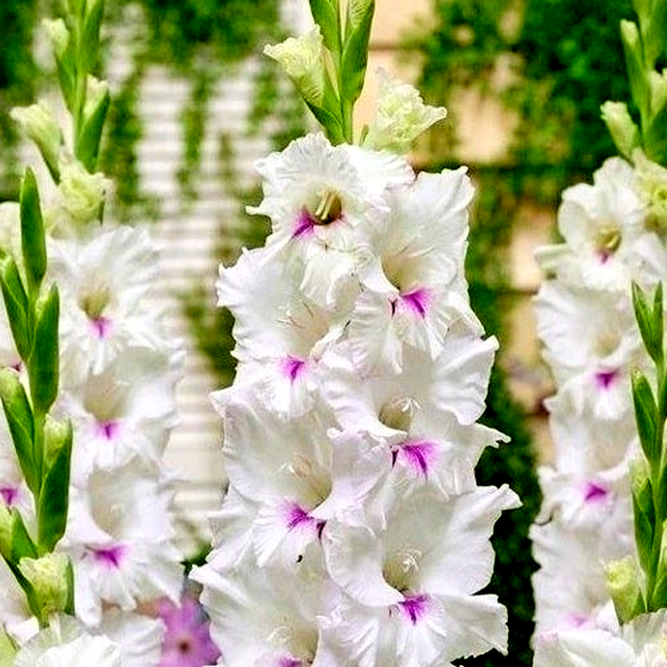 Native primarily to South Africa, with some species from the Mediterranean region, gladioli have become popular garden plants worldwide. They bloom in summer and are prized as cut flowers due to their impressive height and long-lasting blooms. The plants prefer full sun and well-drained soil, and in colder climates, the corms must be lifted and stored indoors during winter. Gladioli are excellent for creating dramatic vertical elements in flower gardens and are commonly grown in rows for cutting. There are over 260 species and countless cultivars, ranging from miniature varieties to giant exhibition types.