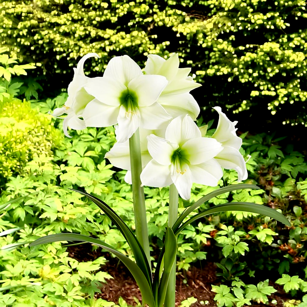 The plant grows from a large, rounded bulb that sends up a thick, hollow flower stalk called a scape, which can reach 12-24 inches tall. Each stalk typically bears 2-6 large, lily-like flowers that bloom in succession. The strap-shaped leaves are glossy green and usually emerge after or alongside the flowers, growing up to 18 inches long.