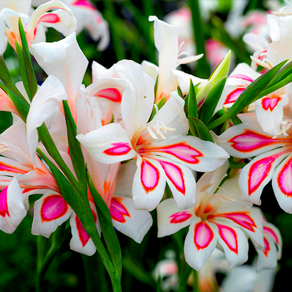 Native primarily to South Africa, with some species from the Mediterranean region, gladioli have become popular garden plants worldwide. They bloom in summer and are prized as cut flowers due to their impressive height and long-lasting blooms. The plants prefer full sun and well-drained soil, and in colder climates, the corms must be lifted and stored indoors during winter. Gladioli are excellent for creating dramatic vertical elements in flower gardens and are commonly grown in rows for cutting. There are over 260 species and countless cultivars, ranging from miniature varieties to giant exhibition types.