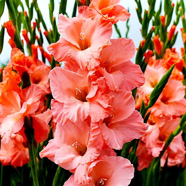 Gladiolus is a genus of perennial flowering plants that grow from corms (bulb-like underground storage organs) and are beloved for their tall, dramatic flower spikes. These striking plants produce sword-shaped leaves and towering stems that can reach 2-5 feet in height, topped with multiple funnel-shaped flowers arranged in dense, vertical clusters called racemes.