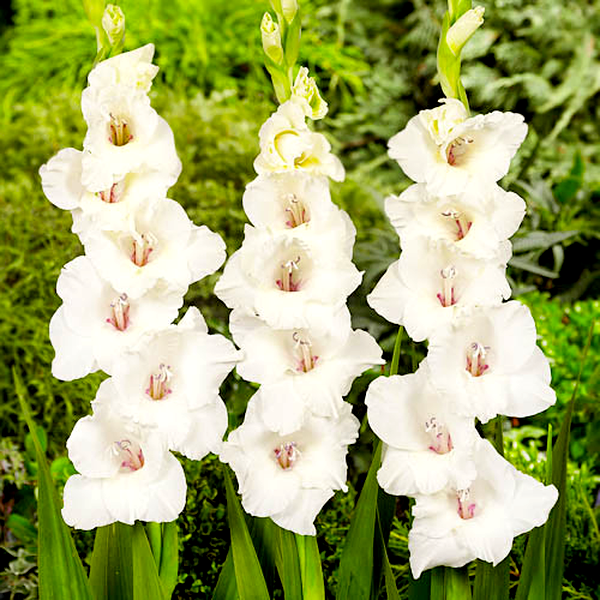 Gladiolus is a genus of perennial flowering plants that grow from corms (bulb-like underground storage organs) and are beloved for their tall, dramatic flower spikes. These striking plants produce sword-shaped leaves and towering stems that can reach 2-5 feet in height, topped with multiple funnel-shaped flowers arranged in dense, vertical clusters called racemes.