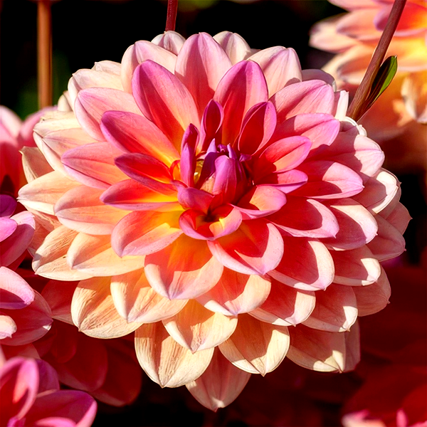 Dahlias grow from underground tubers and typically reach heights of 1-6 feet, depending on the variety. They bloom from midsummer until the first frost, making them valuable for extended garden color. The plants prefer full sun and well-drained, fertile soil. In colder climates, the tubers must be lifted and stored indoors during winter. Dahlias are excellent for cut flowers and are popular in both cottage gardens and formal landscapes. There are over 40 species and thousands of cultivars, making them one of the most diverse flowering plants available to gardeners.