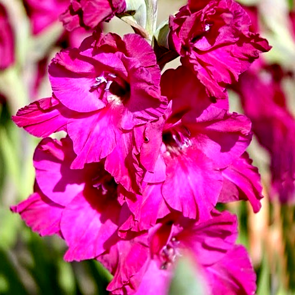 Native primarily to South Africa, with some species from the Mediterranean region, gladioli have become popular garden plants worldwide. They bloom in summer and are prized as cut flowers due to their impressive height and long-lasting blooms. The plants prefer full sun and well-drained soil, and in colder climates, the corms must be lifted and stored indoors during winter. Gladioli are excellent for creating dramatic vertical elements in flower gardens and are commonly grown in rows for cutting. There are over 260 species and countless cultivars, ranging from miniature varieties to giant exhibition types.