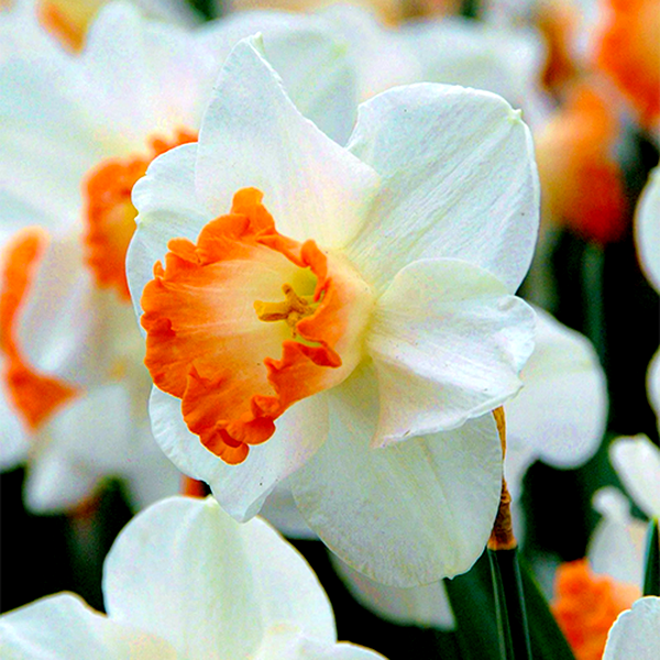 The classic narcissus flower features six outer petals (technically tepals) surrounding a central corona or "trumpet" that can be short like a cup or long and flared. This unique structure creates their instantly recognizable silhouette. Colors range from pure white and sunny yellow to combinations of cream, orange, pink, and even green, with many varieties featuring contrasting coronas that add visual interest.