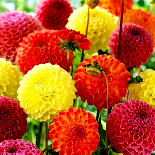 The blooms display remarkable diversity in shape, from simple single-petaled varieties to complex forms like pompons, cactus types with spiky petals, decorative doubles, and ball-shaped flowers. Colors span nearly the entire spectrum except true blue, including vibrant reds, oranges, yellows, pinks, purples, whites, and striking bi-colors or variegated patterns.
