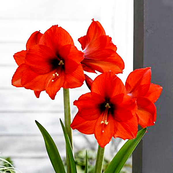 The plant grows from a large, rounded bulb that sends up a thick, hollow flower stalk called a scape, which can reach 12-24 inches tall. Each stalk typically bears 2-6 large, lily-like flowers that bloom in succession. The strap-shaped leaves are glossy green and usually emerge after or alongside the flowers, growing up to 18 inches long.