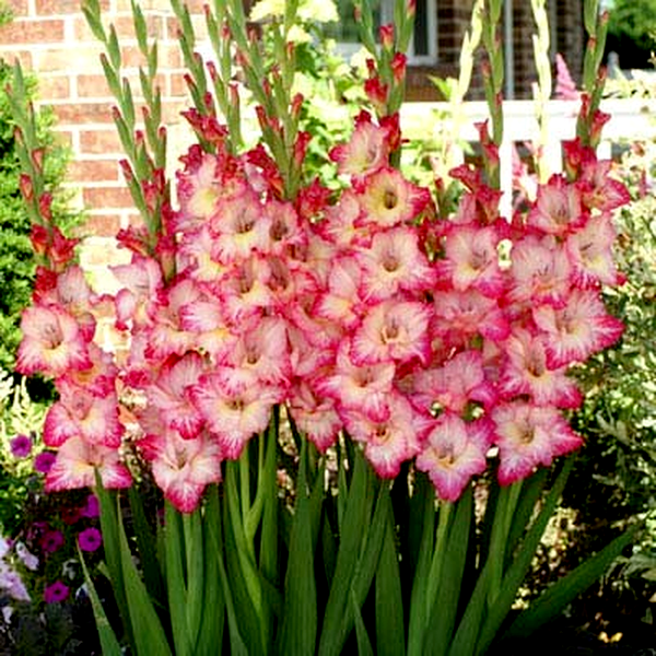 Gladiolus is a genus of perennial flowering plants that grow from corms (bulb-like underground storage organs) and are beloved for their tall, dramatic flower spikes. These striking plants produce sword-shaped leaves and towering stems that can reach 2-5 feet in height, topped with multiple funnel-shaped flowers arranged in dense, vertical clusters called racemes.