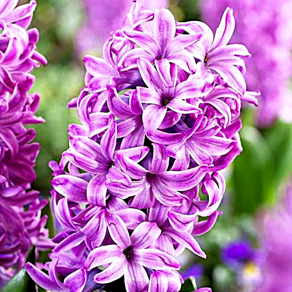 Hyacinths are fragrant spring-blooming bulbs known for their dense, cylindrical flower spikes and intense sweet perfume. These bulbs produce sturdy stems topped with clusters of small, waxy flowers in vibrant colors including deep purple, pink, white, yellow, orange, and various shades of blue.