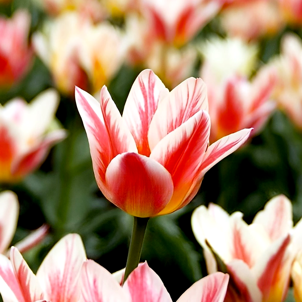 Tulips are iconic spring-blooming bulbs renowned for their elegant cup-shaped flowers and wide array of colors and forms. These bulbs produce single stems with distinctive flowers that can be found in virtually every color except true blue, including solid hues, bi-colors, and striking patterns with stripes, flames, or picotee edges.