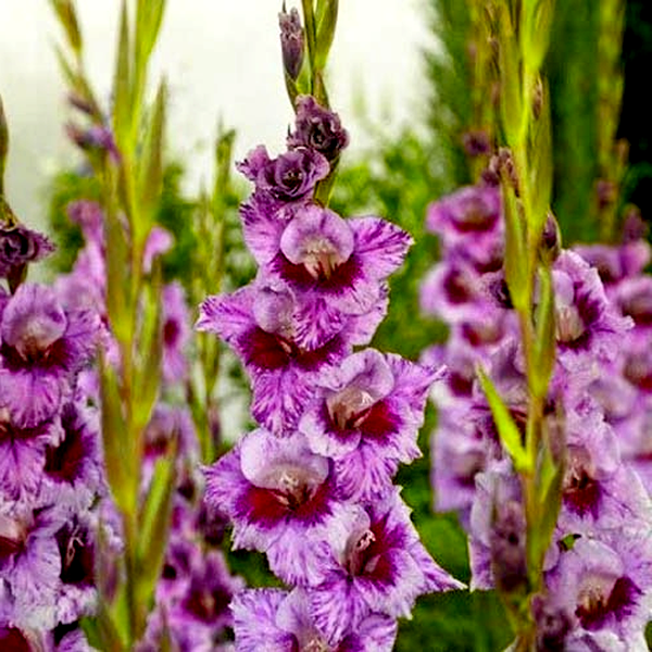Native primarily to South Africa, with some species from the Mediterranean region, gladioli have become popular garden plants worldwide. They bloom in summer and are prized as cut flowers due to their impressive height and long-lasting blooms. The plants prefer full sun and well-drained soil, and in colder climates, the corms must be lifted and stored indoors during winter. Gladioli are excellent for creating dramatic vertical elements in flower gardens and are commonly grown in rows for cutting. There are over 260 species and countless cultivars, ranging from miniature varieties to giant exhibition types.