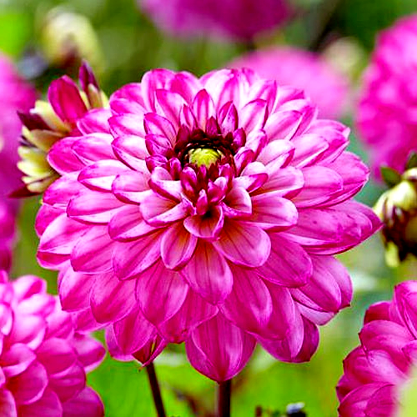 Dahlias grow from underground tubers and typically reach heights of 1-6 feet, depending on the variety. They bloom from midsummer until the first frost, making them valuable for extended garden color. The plants prefer full sun and well-drained, fertile soil. In colder climates, the tubers must be lifted and stored indoors during winter. Dahlias are excellent for cut flowers and are popular in both cottage gardens and formal landscapes. There are over 40 species and thousands of cultivars, making them one of the most diverse flowering plants available to gardeners.