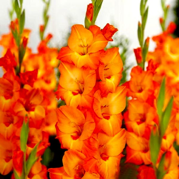Gladiolus is a genus of perennial flowering plants that grow from corms (bulb-like underground storage organs) and are beloved for their tall, dramatic flower spikes. These striking plants produce sword-shaped leaves and towering stems that can reach 2-5 feet in height, topped with multiple funnel-shaped flowers arranged in dense, vertical clusters called racemes.