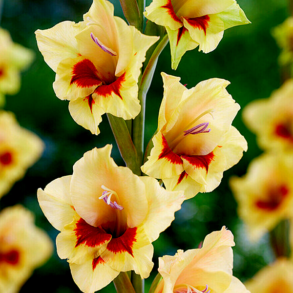 Native primarily to South Africa, with some species from the Mediterranean region, gladioli have become popular garden plants worldwide. They bloom in summer and are prized as cut flowers due to their impressive height and long-lasting blooms. The plants prefer full sun and well-drained soil, and in colder climates, the corms must be lifted and stored indoors during winter. Gladioli are excellent for creating dramatic vertical elements in flower gardens and are commonly grown in rows for cutting. There are over 260 species and countless cultivars, ranging from miniature varieties to giant exhibition types.