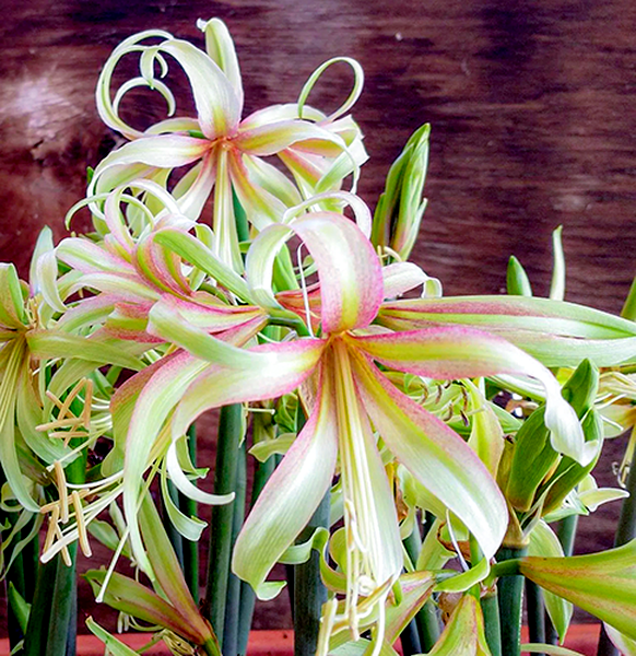 The plant grows from a large, rounded bulb that sends up a thick, hollow flower stalk called a scape, which can reach 12-24 inches tall. Each stalk typically bears 2-6 large, lily-like flowers that bloom in succession. The strap-shaped leaves are glossy green and usually emerge after or alongside the flowers, growing up to 18 inches long.