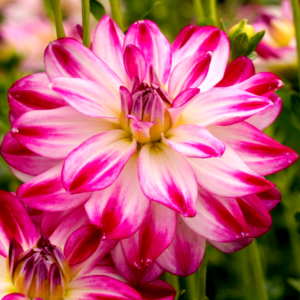 Dahlias grow from underground tubers and typically reach heights of 1-6 feet, depending on the variety. They bloom from midsummer until the first frost, making them valuable for extended garden color. The plants prefer full sun and well-drained, fertile soil. In colder climates, the tubers must be lifted and stored indoors during winter. Dahlias are excellent for cut flowers and are popular in both cottage gardens and formal landscapes. There are over 40 species and thousands of cultivars, making them one of the most diverse flowering plants available to gardeners.