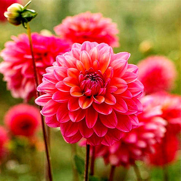 Dahlias grow from underground tubers and typically reach heights of 1-6 feet, depending on the variety. They bloom from midsummer until the first frost, making them valuable for extended garden color. The plants prefer full sun and well-drained, fertile soil. In colder climates, the tubers must be lifted and stored indoors during winter. Dahlias are excellent for cut flowers and are popular in both cottage gardens and formal landscapes. There are over 40 species and thousands of cultivars, making them one of the most diverse flowering plants available to gardeners.