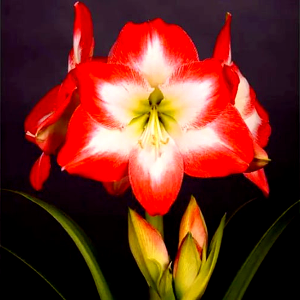 The plant grows from a large, rounded bulb that sends up a thick, hollow flower stalk called a scape, which can reach 12-24 inches tall. Each stalk typically bears 2-6 large, lily-like flowers that bloom in succession. The strap-shaped leaves are glossy green and usually emerge after or alongside the flowers, growing up to 18 inches long.