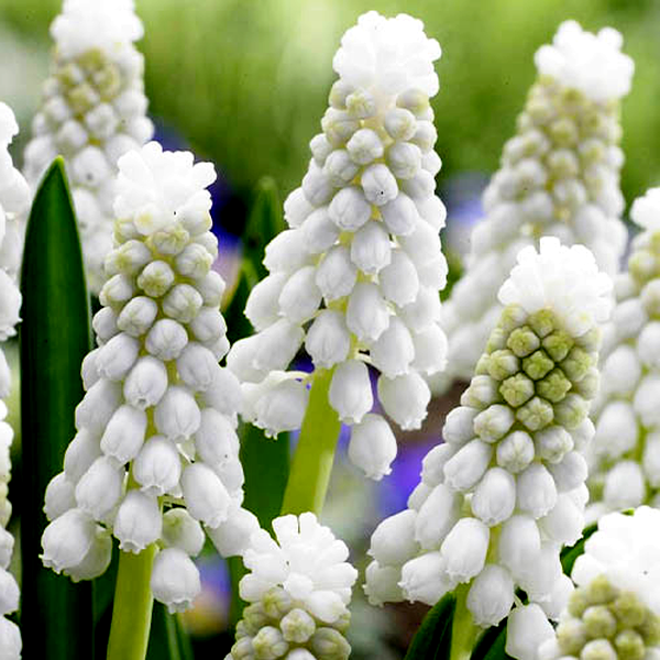 Muscari flowers bloom in early to mid-spring and are popular in gardens for their reliability, naturalizing ability, and early color. They're often planted in masses under trees, in rock gardens, or naturalized in lawns. The flowers are also valued by pollinators, particularly bees, during the early season when few other flowers are available.