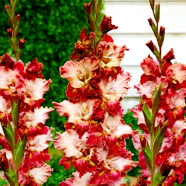 Native primarily to South Africa, with some species from the Mediterranean region, gladioli have become popular garden plants worldwide. They bloom in summer and are prized as cut flowers due to their impressive height and long-lasting blooms. The plants prefer full sun and well-drained soil, and in colder climates, the corms must be lifted and stored indoors during winter. Gladioli are excellent for creating dramatic vertical elements in flower gardens and are commonly grown in rows for cutting. There are over 260 species and countless cultivars, ranging from miniature varieties to giant exhibition types.