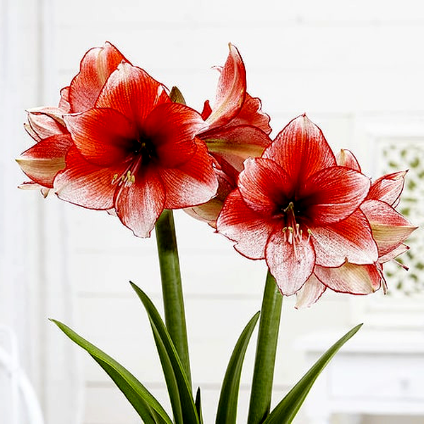 The plant grows from a large, rounded bulb that sends up a thick, hollow flower stalk called a scape, which can reach 12-24 inches tall. Each stalk typically bears 2-6 large, lily-like flowers that bloom in succession. The strap-shaped leaves are glossy green and usually emerge after or alongside the flowers, growing up to 18 inches long.