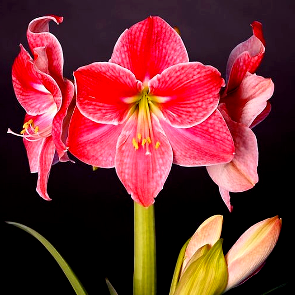 The plant grows from a large, rounded bulb that sends up a thick, hollow flower stalk called a scape, which can reach 12-24 inches tall. Each stalk typically bears 2-6 large, lily-like flowers that bloom in succession. The strap-shaped leaves are glossy green and usually emerge after or alongside the flowers, growing up to 18 inches long.