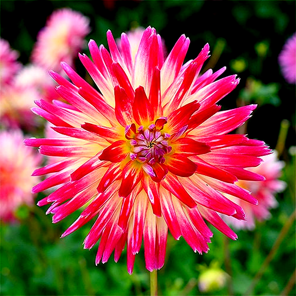 Dahlias grow from underground tubers and typically reach heights of 1-6 feet, depending on the variety. They bloom from midsummer until the first frost, making them valuable for extended garden color. The plants prefer full sun and well-drained, fertile soil. In colder climates, the tubers must be lifted and stored indoors during winter. Dahlias are excellent for cut flowers and are popular in both cottage gardens and formal landscapes. There are over 40 species and thousands of cultivars, making them one of the most diverse flowering plants available to gardeners.