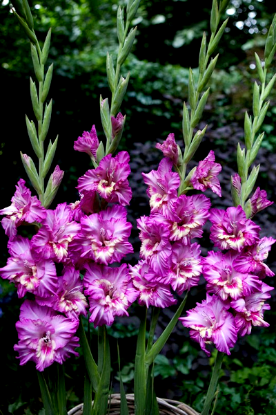 Native primarily to South Africa, with some species from the Mediterranean region, gladioli have become popular garden plants worldwide. They bloom in summer and are prized as cut flowers due to their impressive height and long-lasting blooms. The plants prefer full sun and well-drained soil, and in colder climates, the corms must be lifted and stored indoors during winter. Gladioli are excellent for creating dramatic vertical elements in flower gardens and are commonly grown in rows for cutting. There are over 260 species and countless cultivars, ranging from miniature varieties to giant exhibition types.