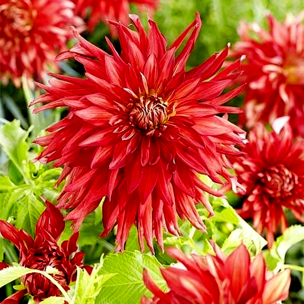 Dahlias grow from underground tubers and typically reach heights of 1-6 feet, depending on the variety. They bloom from midsummer until the first frost, making them valuable for extended garden color. The plants prefer full sun and well-drained, fertile soil. In colder climates, the tubers must be lifted and stored indoors during winter. Dahlias are excellent for cut flowers and are popular in both cottage gardens and formal landscapes. There are over 40 species and thousands of cultivars, making them one of the most diverse flowering plants available to gardeners.