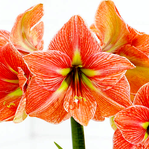 The plant grows from a large, rounded bulb that sends up a thick, hollow flower stalk called a scape, which can reach 12-24 inches tall. Each stalk typically bears 2-6 large, lily-like flowers that bloom in succession. The strap-shaped leaves are glossy green and usually emerge after or alongside the flowers, growing up to 18 inches long.