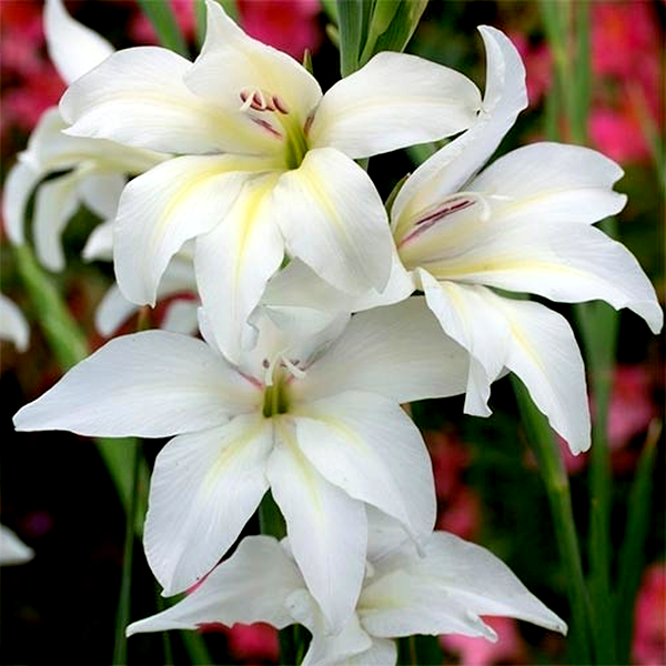 Native primarily to South Africa, with some species from the Mediterranean region, gladioli have become popular garden plants worldwide. They bloom in summer and are prized as cut flowers due to their impressive height and long-lasting blooms. The plants prefer full sun and well-drained soil, and in colder climates, the corms must be lifted and stored indoors during winter. Gladioli are excellent for creating dramatic vertical elements in flower gardens and are commonly grown in rows for cutting. There are over 260 species and countless cultivars, ranging from miniature varieties to giant exhibition types.