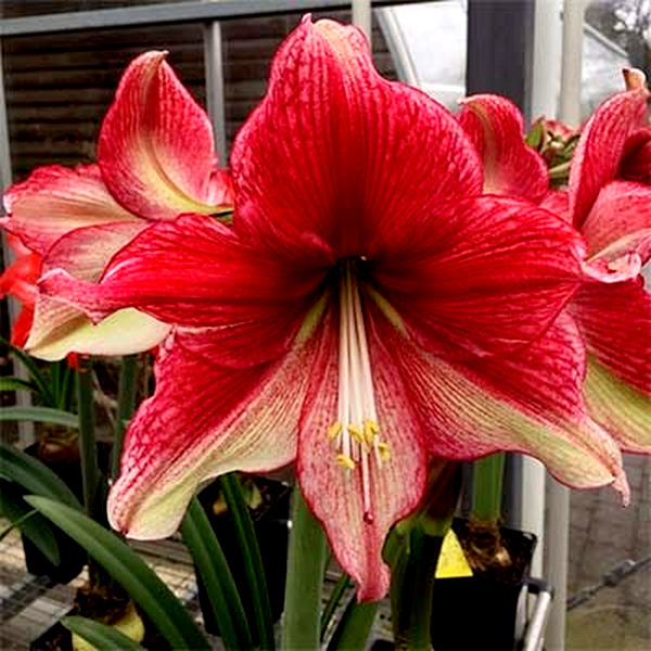 The plant grows from a large, rounded bulb that sends up a thick, hollow flower stalk called a scape, which can reach 12-24 inches tall. Each stalk typically bears 2-6 large, lily-like flowers that bloom in succession. The strap-shaped leaves are glossy green and usually emerge after or alongside the flowers, growing up to 18 inches long.