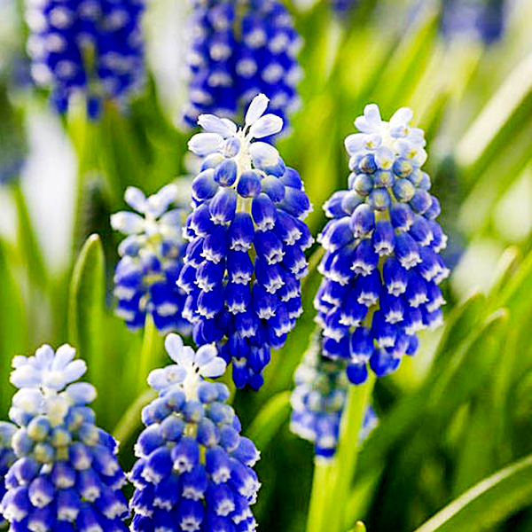 These charming spring flowers are native to the Mediterranean region and parts of Asia. They're characterized by their distinctive clusters of small, bell-shaped or urn-shaped flowers that resemble tiny grapes, hence the common name "grape hyacinth." The flowers typically come in shades of blue, purple, white, or yellow, and grow on short spikes above grass-like foliage.