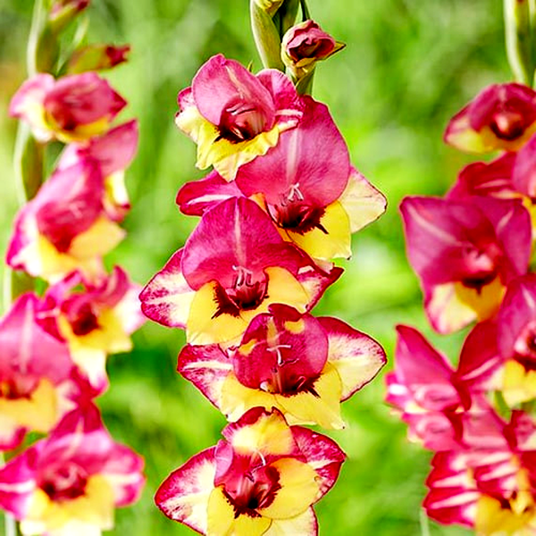 Native primarily to South Africa, with some species from the Mediterranean region, gladioli have become popular garden plants worldwide. They bloom in summer and are prized as cut flowers due to their impressive height and long-lasting blooms. The plants prefer full sun and well-drained soil, and in colder climates, the corms must be lifted and stored indoors during winter. Gladioli are excellent for creating dramatic vertical elements in flower gardens and are commonly grown in rows for cutting. There are over 260 species and countless cultivars, ranging from miniature varieties to giant exhibition types.