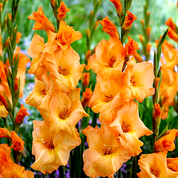 Native primarily to South Africa, with some species from the Mediterranean region, gladioli have become popular garden plants worldwide. They bloom in summer and are prized as cut flowers due to their impressive height and long-lasting blooms. The plants prefer full sun and well-drained soil, and in colder climates, the corms must be lifted and stored indoors during winter. Gladioli are excellent for creating dramatic vertical elements in flower gardens and are commonly grown in rows for cutting. There are over 260 species and countless cultivars, ranging from miniature varieties to giant exhibition types.