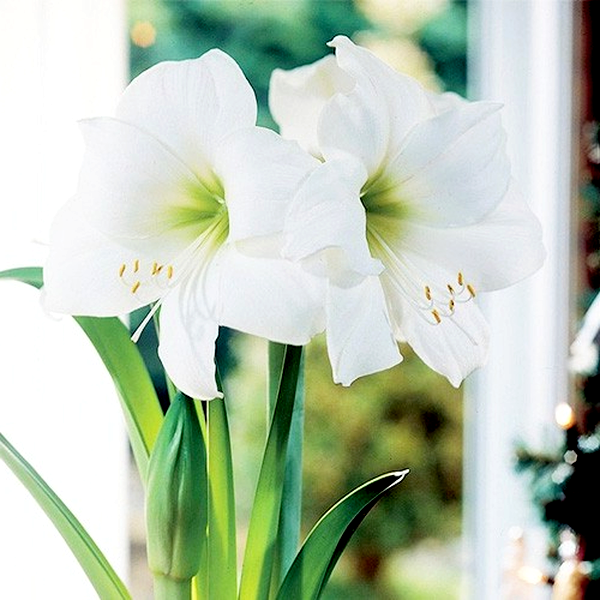 The plant grows from a large, rounded bulb that sends up a thick, hollow flower stalk called a scape, which can reach 12-24 inches tall. Each stalk typically bears 2-6 large, lily-like flowers that bloom in succession. The strap-shaped leaves are glossy green and usually emerge after or alongside the flowers, growing up to 18 inches long.