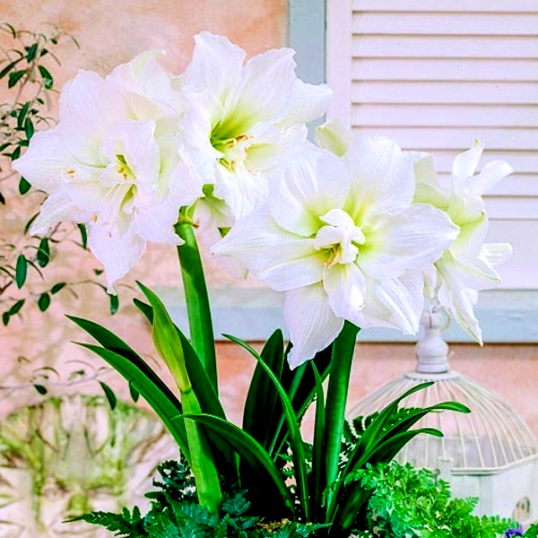 The plant grows from a large, rounded bulb that sends up a thick, hollow flower stalk called a scape, which can reach 12-24 inches tall. Each stalk typically bears 2-6 large, lily-like flowers that bloom in succession. The strap-shaped leaves are glossy green and usually emerge after or alongside the flowers, growing up to 18 inches long.