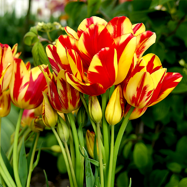 Tulips are iconic spring-blooming bulbs renowned for their elegant cup-shaped flowers and wide array of colors and forms. These bulbs produce single stems with distinctive flowers that can be found in virtually every color except true blue, including solid hues, bi-colors, and striking patterns with stripes, flames, or picotee edges.