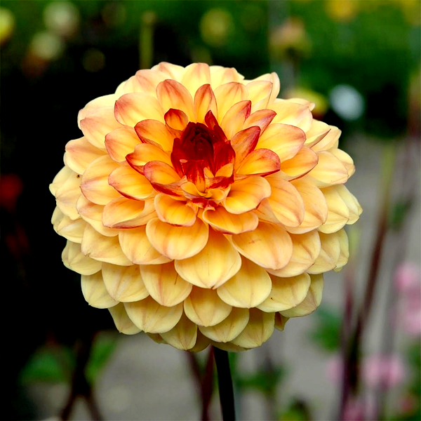 Dahlias grow from underground tubers and typically reach heights of 1-6 feet, depending on the variety. They bloom from midsummer until the first frost, making them valuable for extended garden color. The plants prefer full sun and well-drained, fertile soil. In colder climates, the tubers must be lifted and stored indoors during winter. Dahlias are excellent for cut flowers and are popular in both cottage gardens and formal landscapes. There are over 40 species and thousands of cultivars, making them one of the most diverse flowering plants available to gardeners.