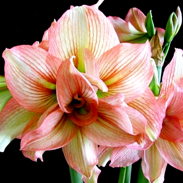 The plant grows from a large, rounded bulb that sends up a thick, hollow flower stalk called a scape, which can reach 12-24 inches tall. Each stalk typically bears 2-6 large, lily-like flowers that bloom in succession. The strap-shaped leaves are glossy green and usually emerge after or alongside the flowers, growing up to 18 inches long.